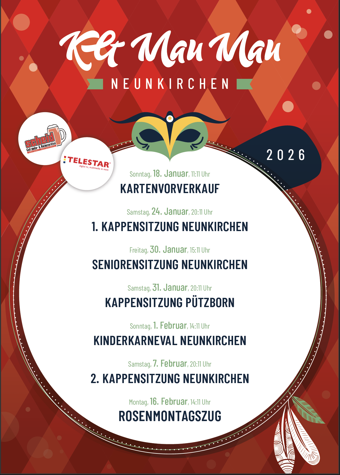Am Freitag, den 30.01. geht‘s ab 15:11 Uhr los mit Büttenreden und Tänzen, Einlass ist ab 14 Uhr.