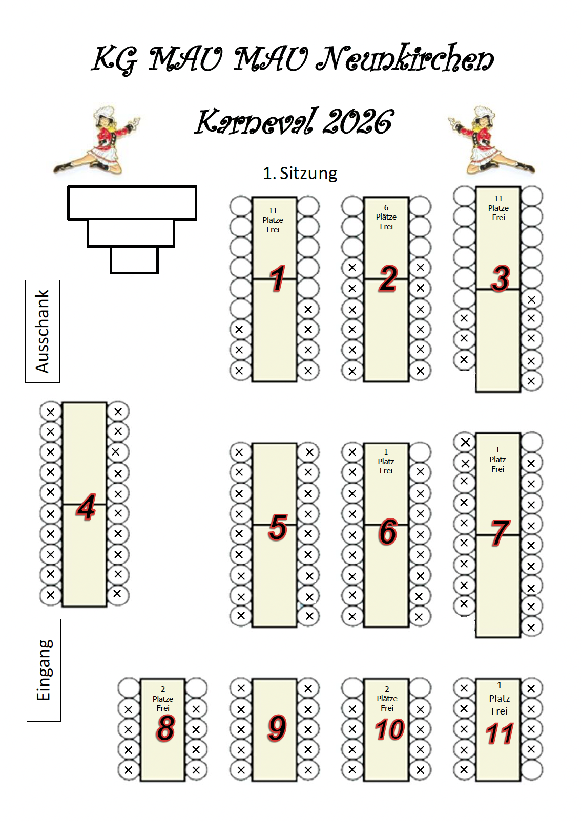 Nach dem Kartenvorverkauf sind für unsere beiden Sitzungen noch folgende Plätze verfügbar:
